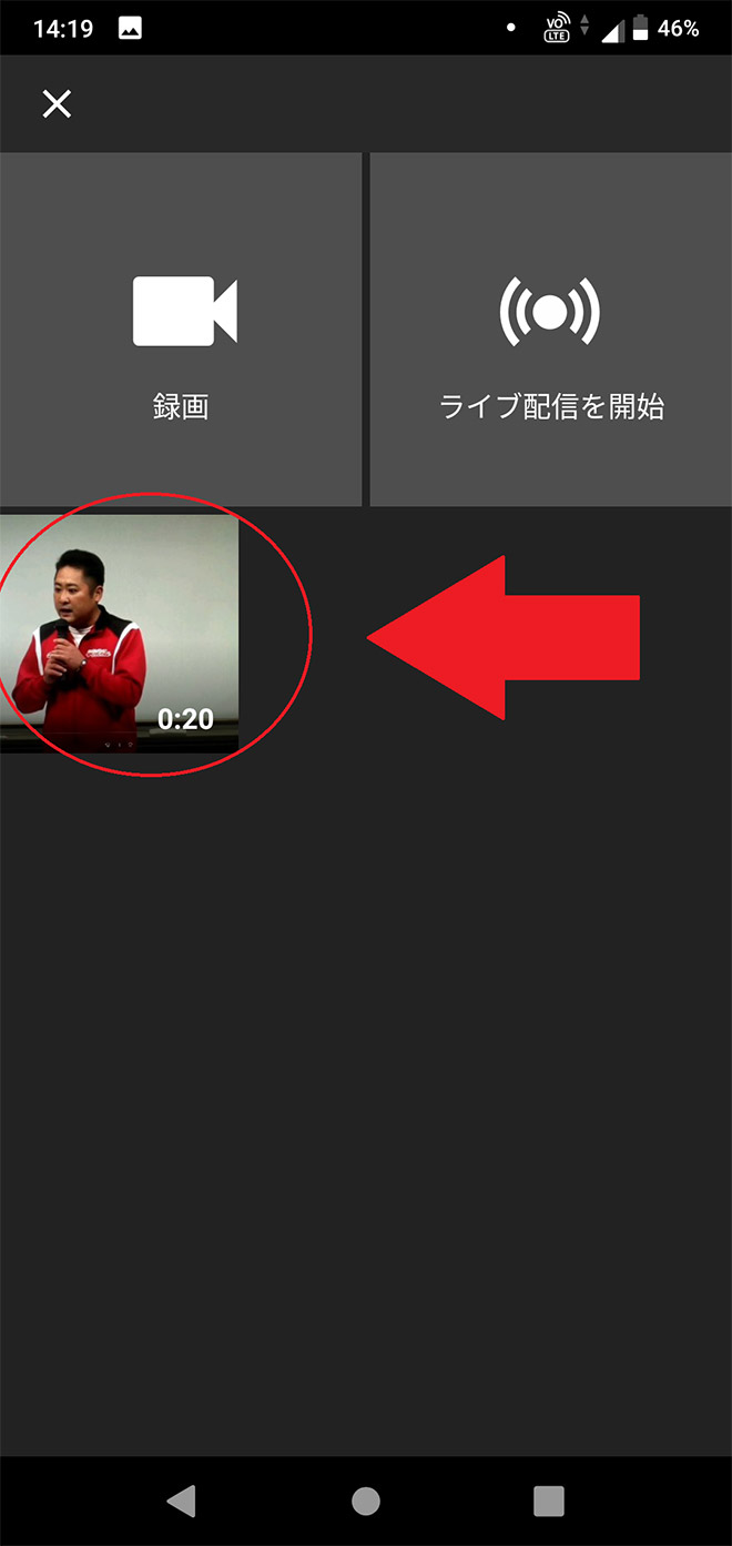 a.YouTubeアプリを開いて、矢印のカメラマークをタップします。